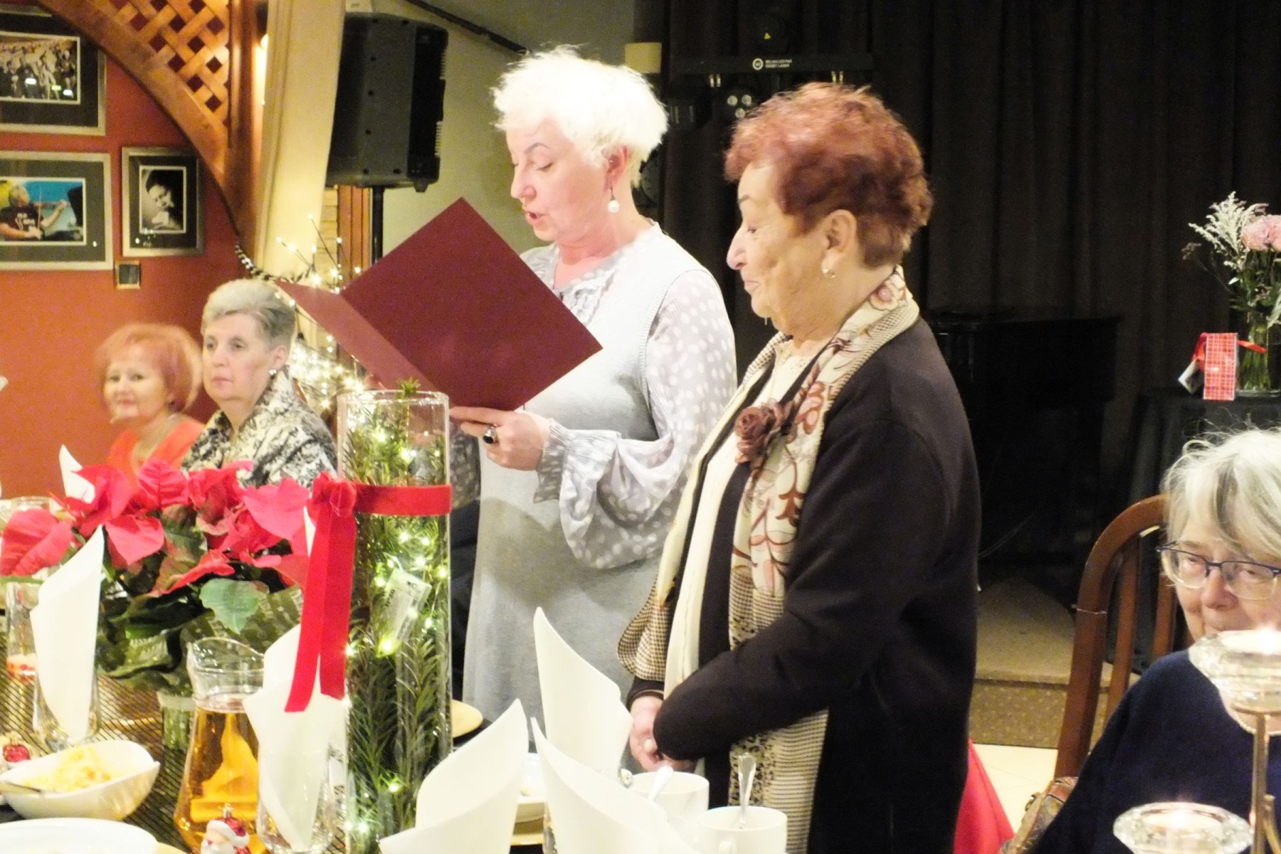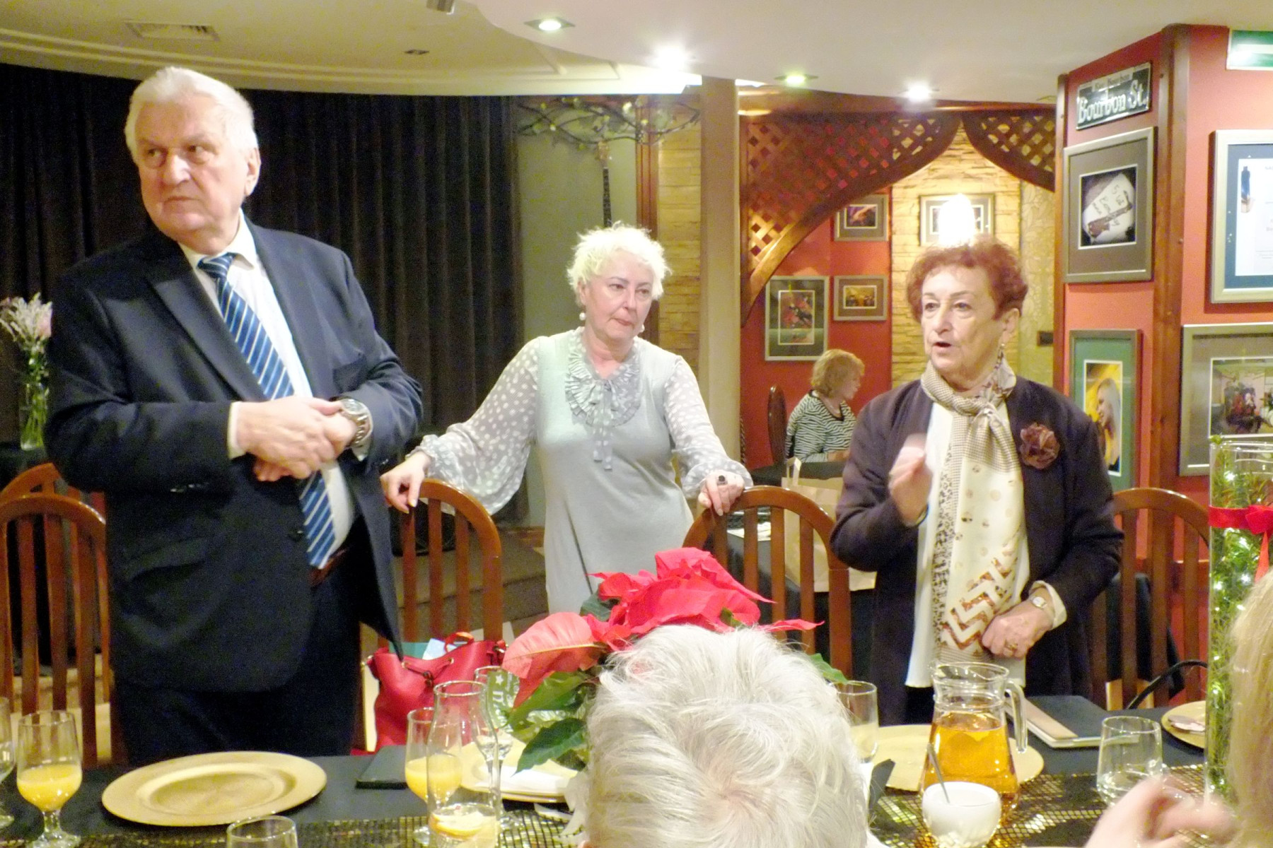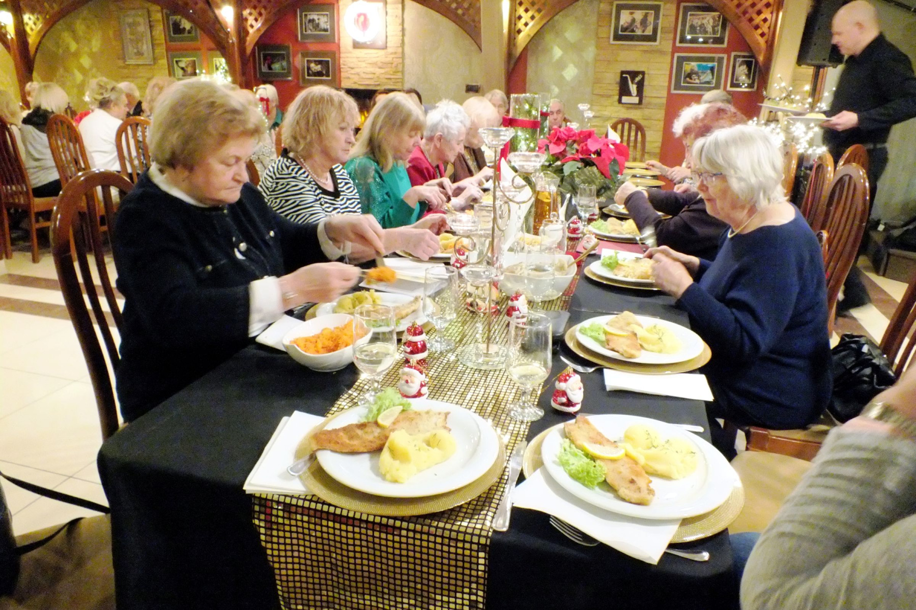 O świąteczny akcent zadbała nasza Przewodnicząca, kol. Ewa Buben, której dzielnie towarzyszył szef restauracji, Pan Marcin. Były więc życzenia z opłatkiem i noworoczny toast z lampką szampana.